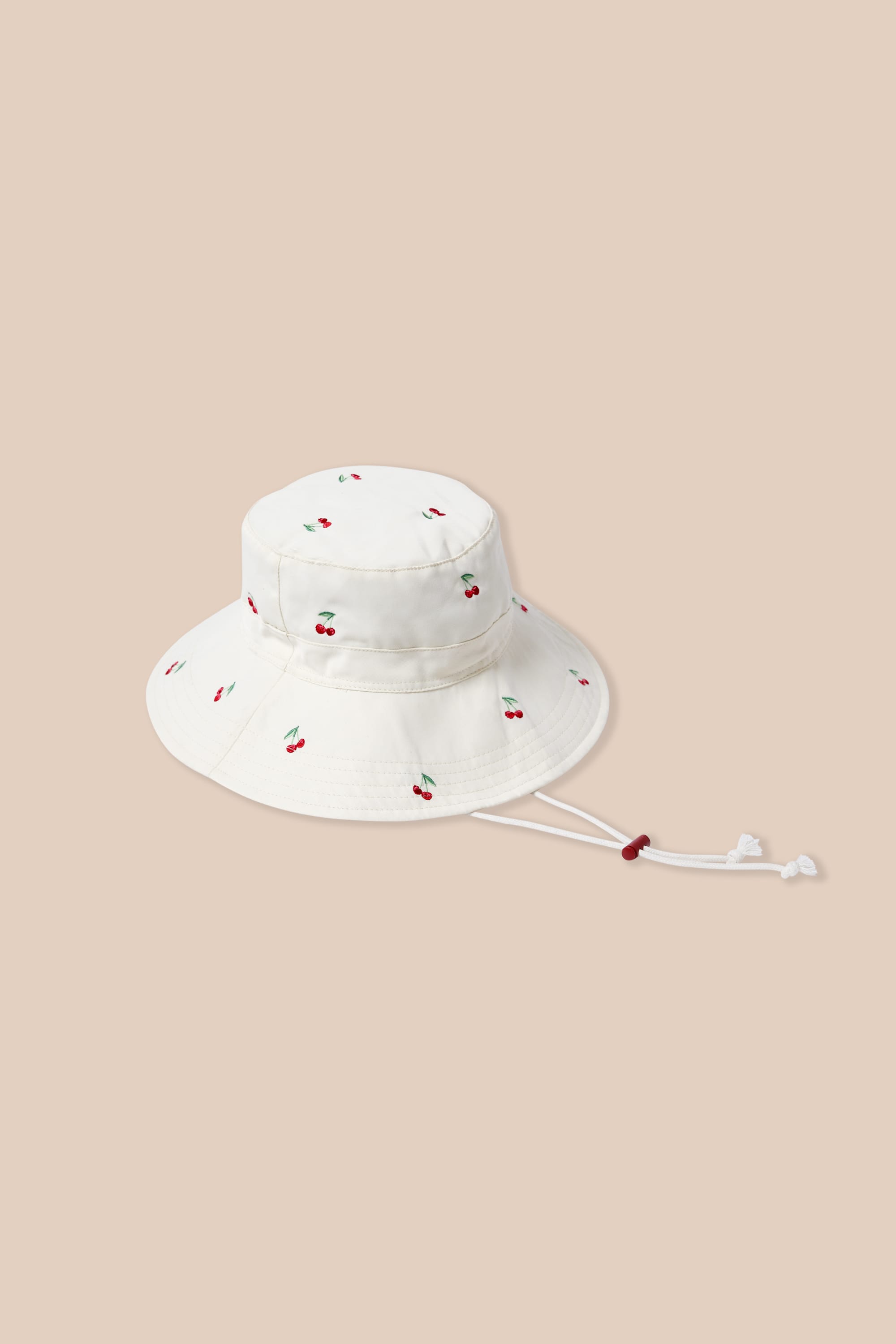 Ce chapeau séduit par son imprimé cerises et sa structure légère, idéale pour compléter vos looks estivaux. Ses liens réglables permettent un ajustement parfait et un maintien confortable tout au long de la journée.