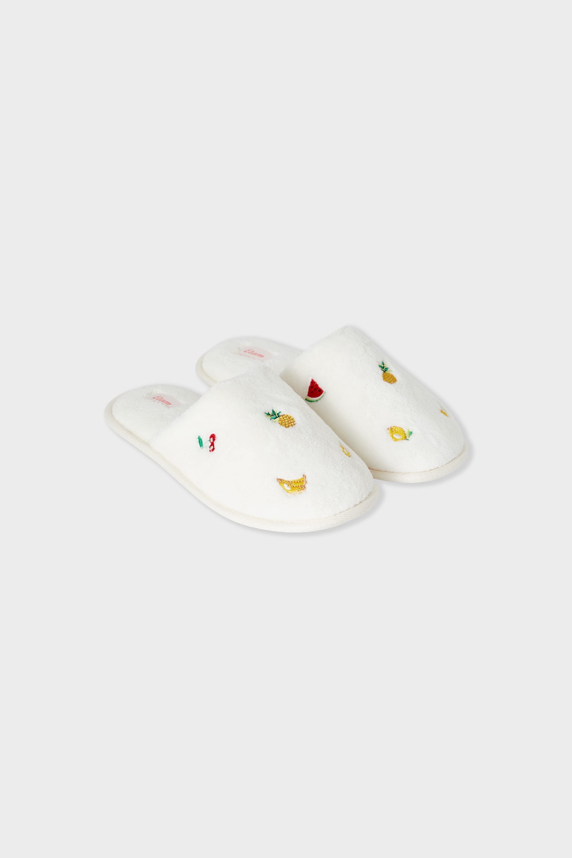 Ces mules chaussons en fausse fourrure séduisent par leurs motifs fruits délicatement brodés. Douces et confortables, elles apportent une touche ludique et colorée à vos moments de détente à la maison.