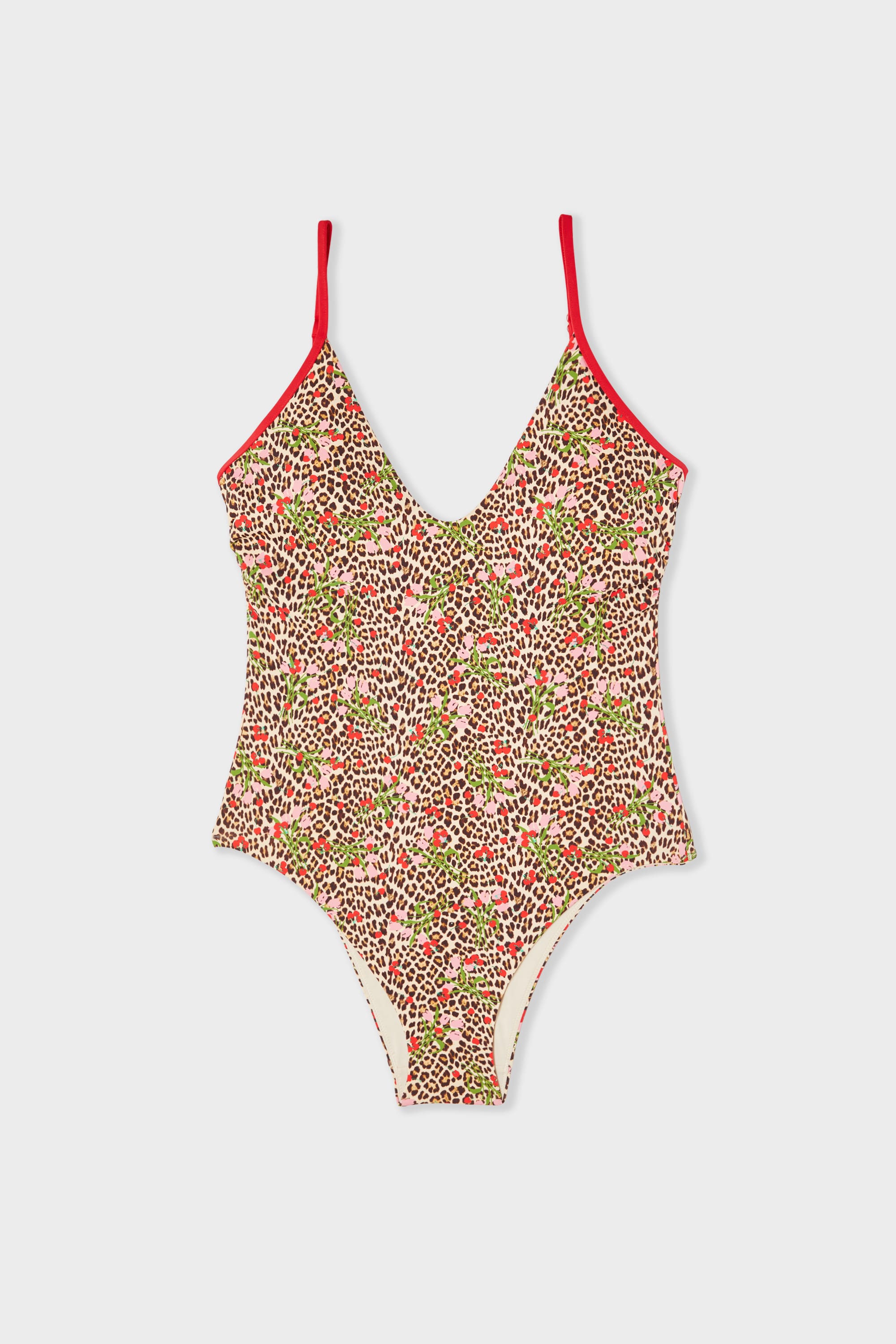 Ce maillot de bain 1 pièce revisite l’imprimé léopard dans une version inédite, ponctuée de fleurs délicates et de cerises éclatantes. Une pièce à l’allure affirmée, sublimée par des finitions contrastées qui soulignent la silhouette.