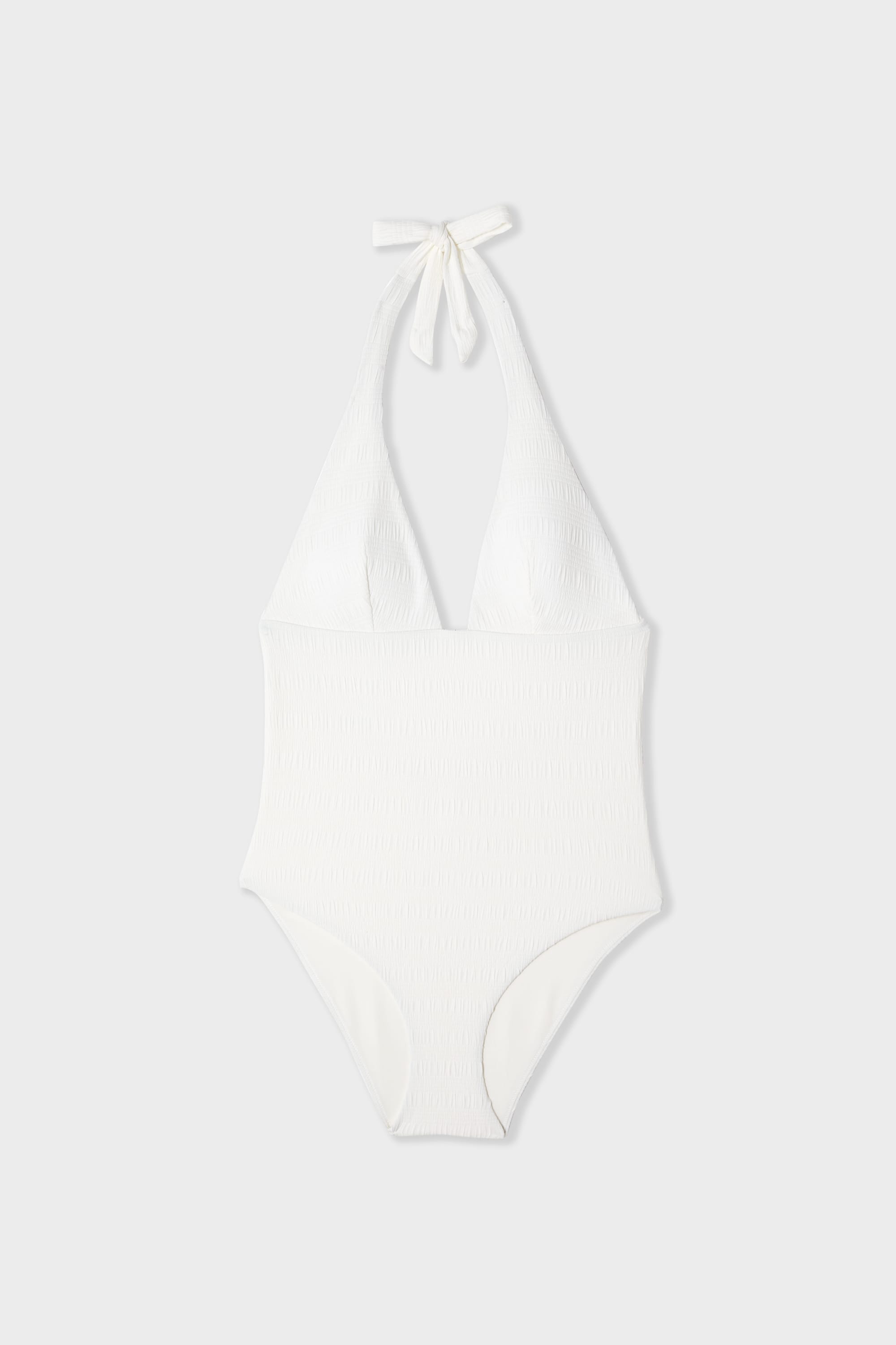 Ce maillot de bain 1 pièce séduit par sa texture smockée qui épouse la silhouette avec élégance. Son décolleté plongeant et sa ligne épurée révèlent une allure féminine et structurée, idéale pour une silhouette mise en valeur en toute simplicité.
