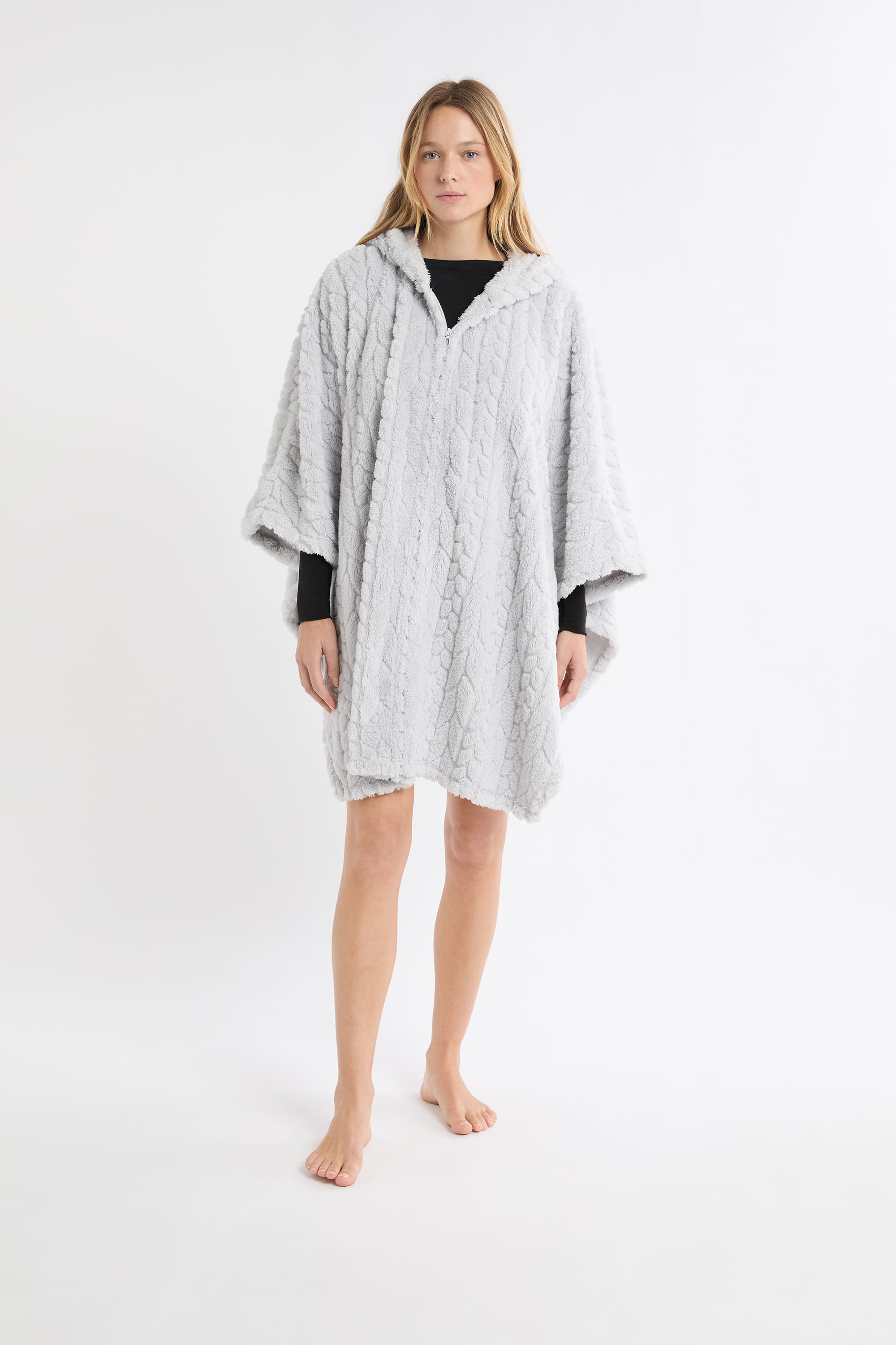 Ultra doux et confortable, ce poncho se porte en superposition pour rester bien en chaud. Confectionné en fausse fourrure, il offre un effet tressé. Il est muni d'une capuche et de manches 3/4.
